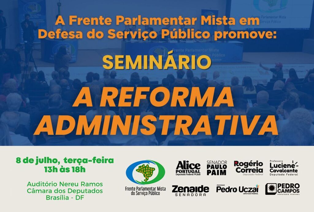 A Frente Parlamentar Mista em Defesa do Serviço Público promove, nesta terça-feira (08), o seminário “A Reforma Administrativa”. O evento acontece das 13h às 18h, no Auditório Nereu Ramos da Câmara dos Deputados, em Brasília.
