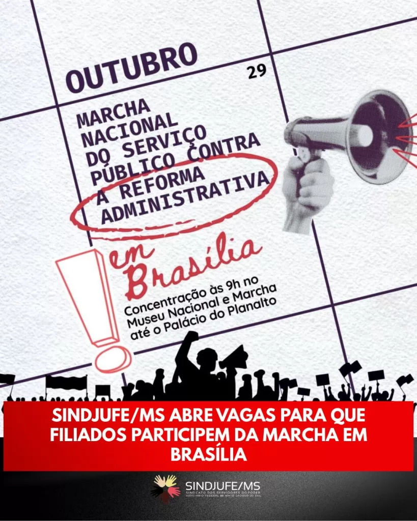 O SINDJUFE/MS abre inscrições para cinco filiados interessados em representar o sindicato na Marcha Nacional do Serviço Público contra a Reforma Administrativa, que acontece no próximo dia 29 de outubro, em Brasília.