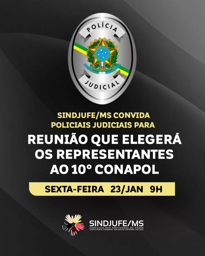 O SINDJUFE/MS convida os Agentes de Polícia Judicial filiados para reunião, na próxima sexta-feira (23), às 9 horas (horário de MS), que elegerá os representantes que irão participar do 10º Encontro do Coletivo Nacional de Agentes e Inspetores da Polícia Judicial (10º CONAPOL), promovido pela Fenajufe.