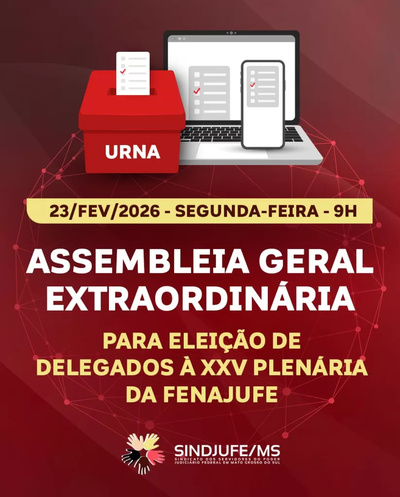 O SINDJUFE/MS realizará, no próximo dia 23 de fevereiro, Assembleia Geral Extraordinária para a eleição dos delegados que representarão a base na XXV Plenária da Fenajufe.
