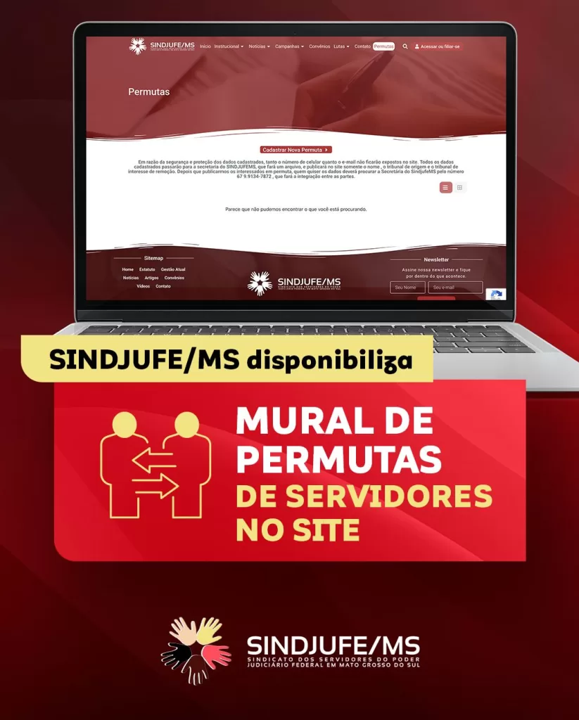 O SINDJUFE/MS disponibiliza em seu site um espaço exclusivo para servidoras e servidores que desejam realizar permutas. A iniciativa visa facilitar a comunicação entre colegas interessados em trocar de lotação, oferecendo um canal organizado e acessível para a divulgação dos pedidos.